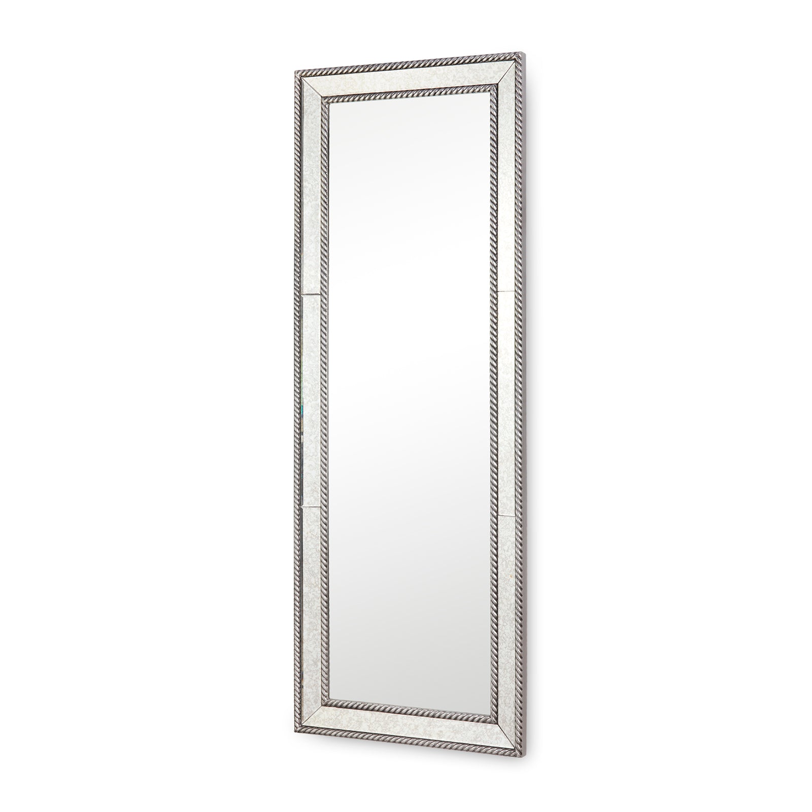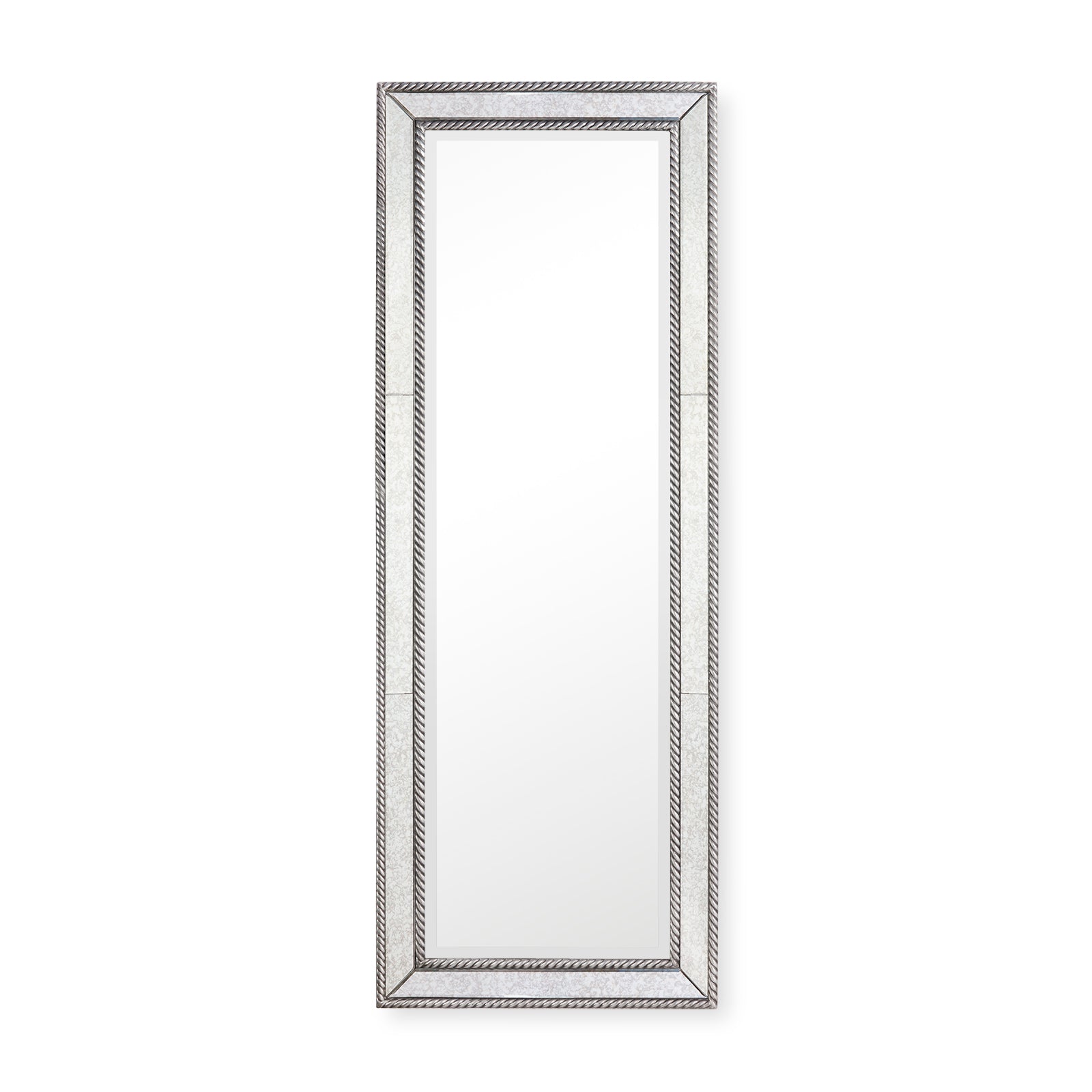 The Cecilia Mirror brings a sense of old-world refinement with a decorative twist. Designed to lean or hang, this full-length piece features a central panel of clear mirror, bordered by a frame of antiqued mirror for subtle depth and patina. A rope-inspired border, finished in silver leaf that catches the light just so, surrounds the piece. Elegant but not overly formal, the Cecilia makes a sophisticated impression.