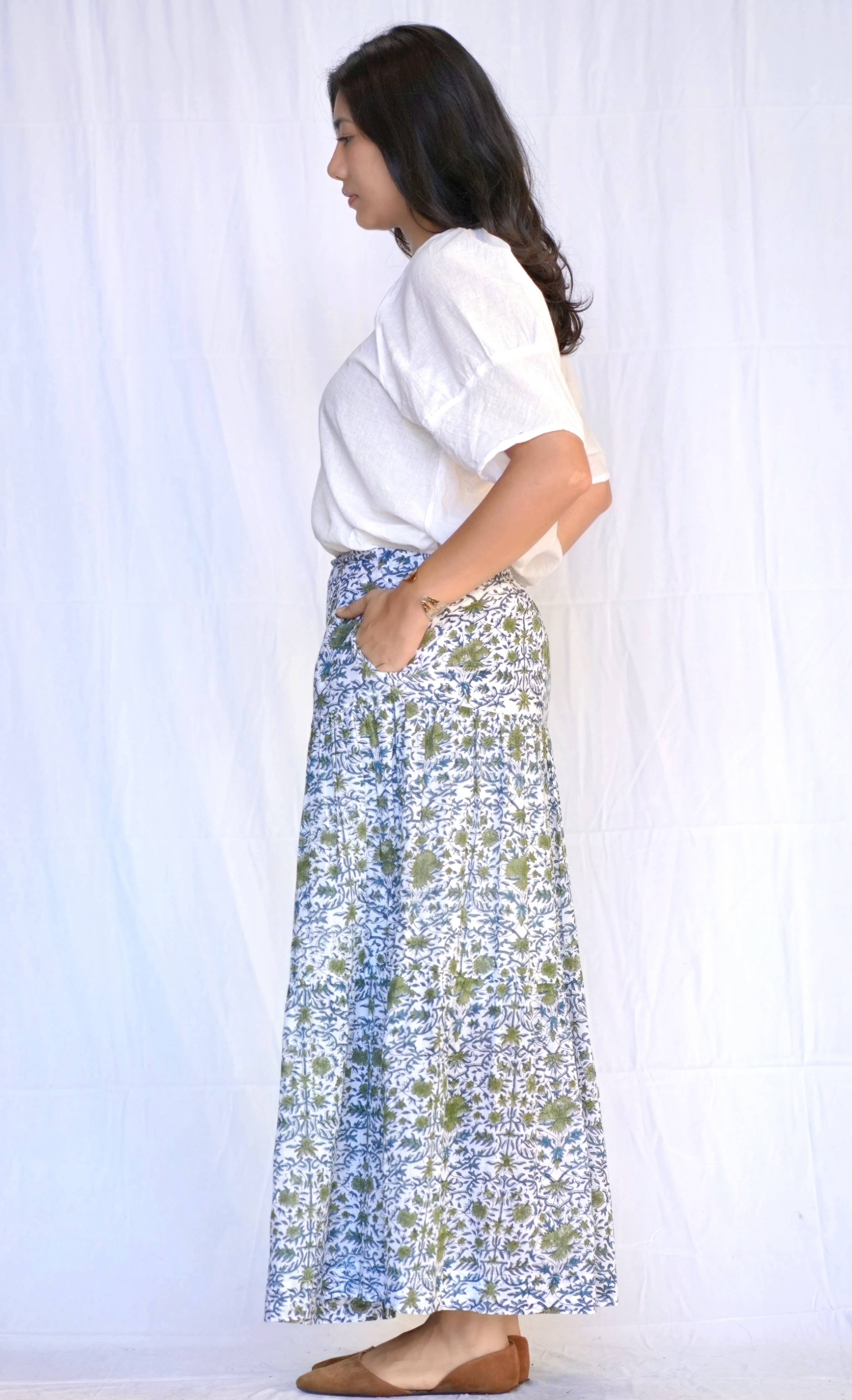Block Printed Tiered Cotton Skirt-Teal Olive