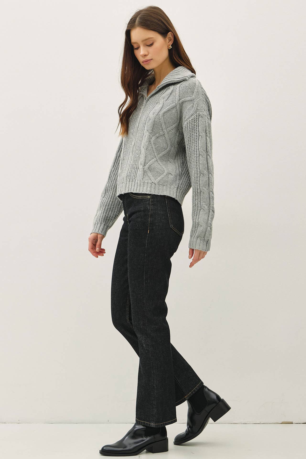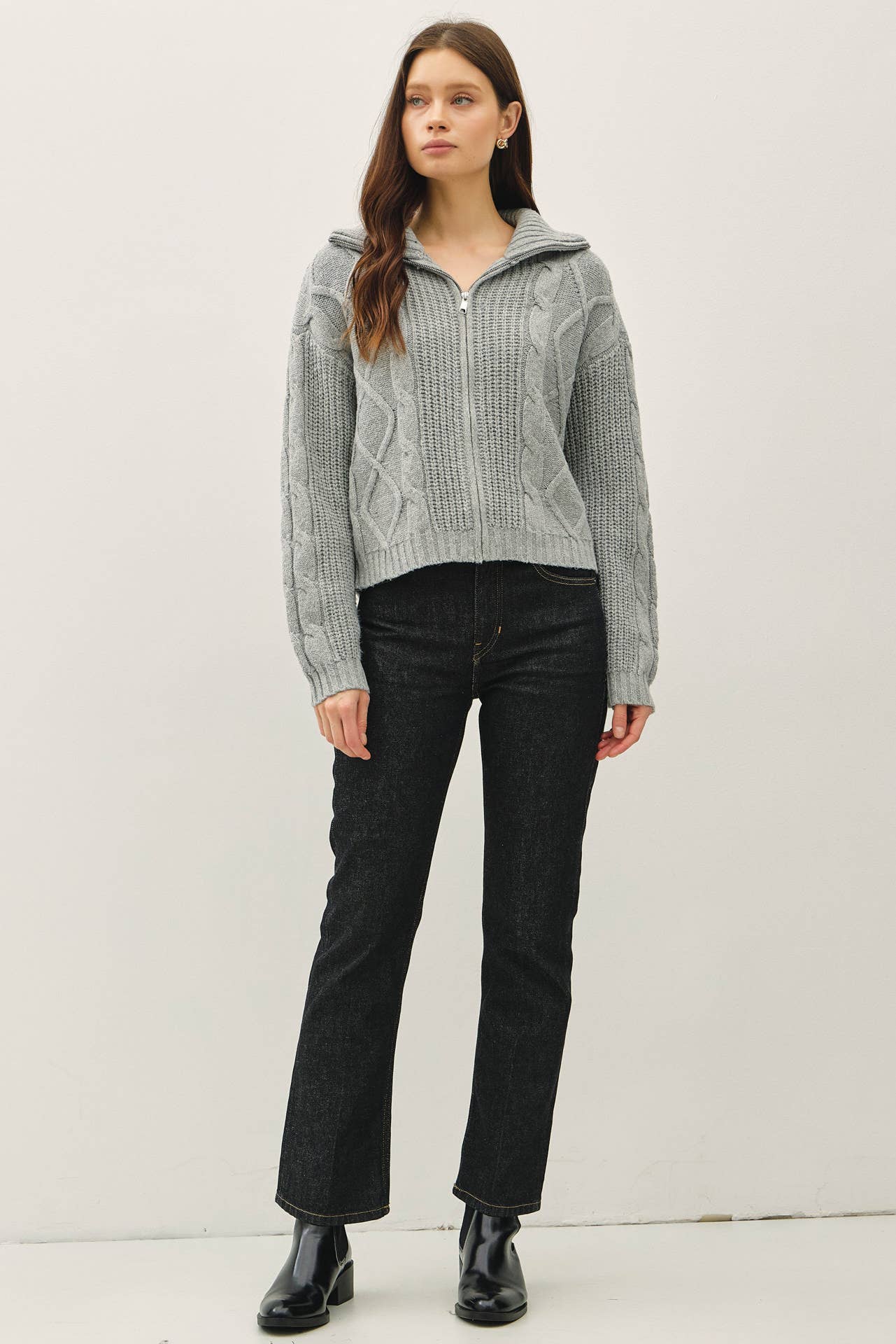 Floppy Collared Cable Zip Up Sweater